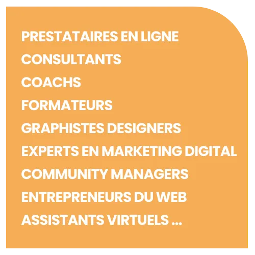Prestataires en ligne • Consultants • Coachs • Formateurs • Graphistes/Designers • Experts en marketing digital • Community managers • Entrepreneurs du web • Assistants virtuels ...